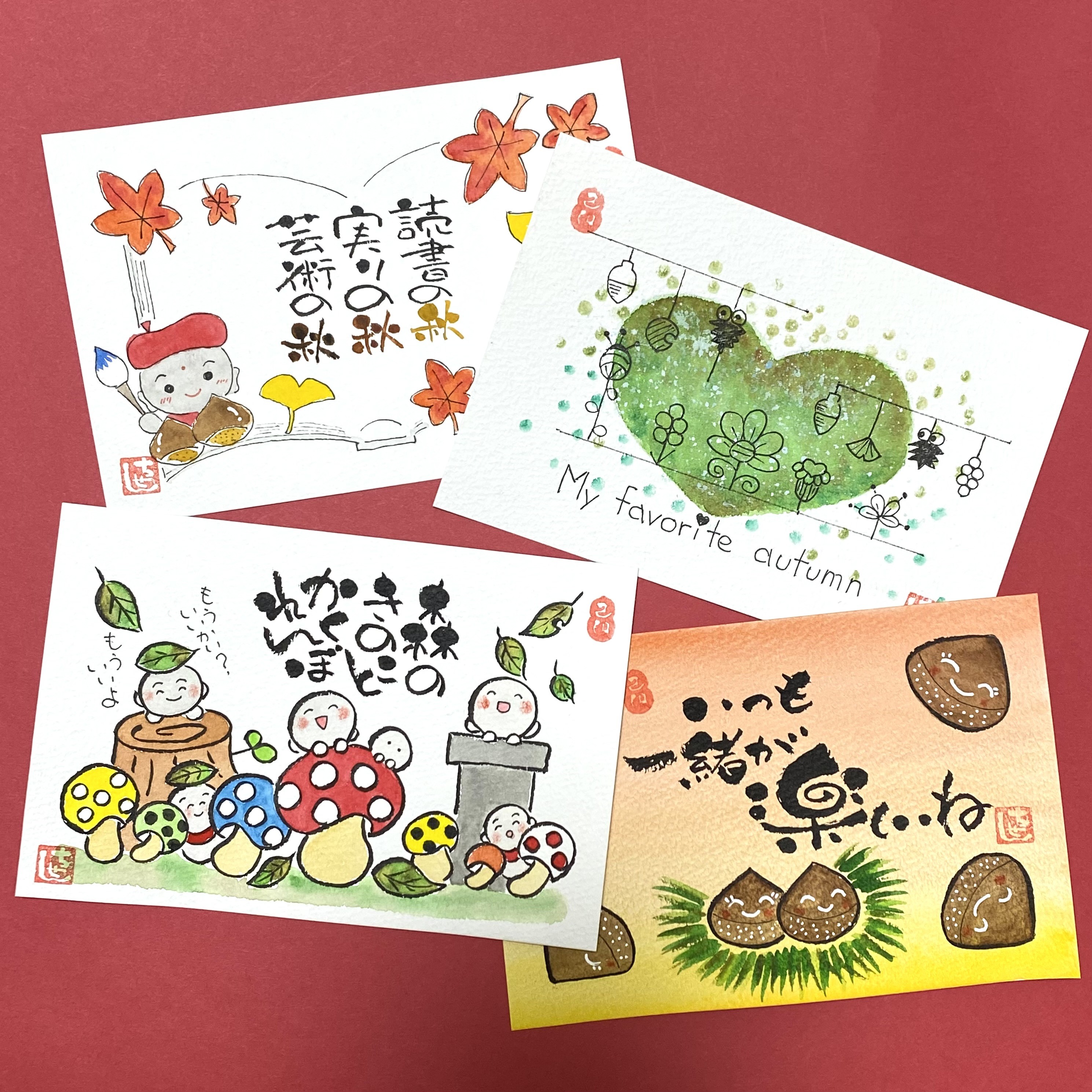 1講座で完結で、講座内でハガキ2〜4枚くらいの作品が仕上がります。