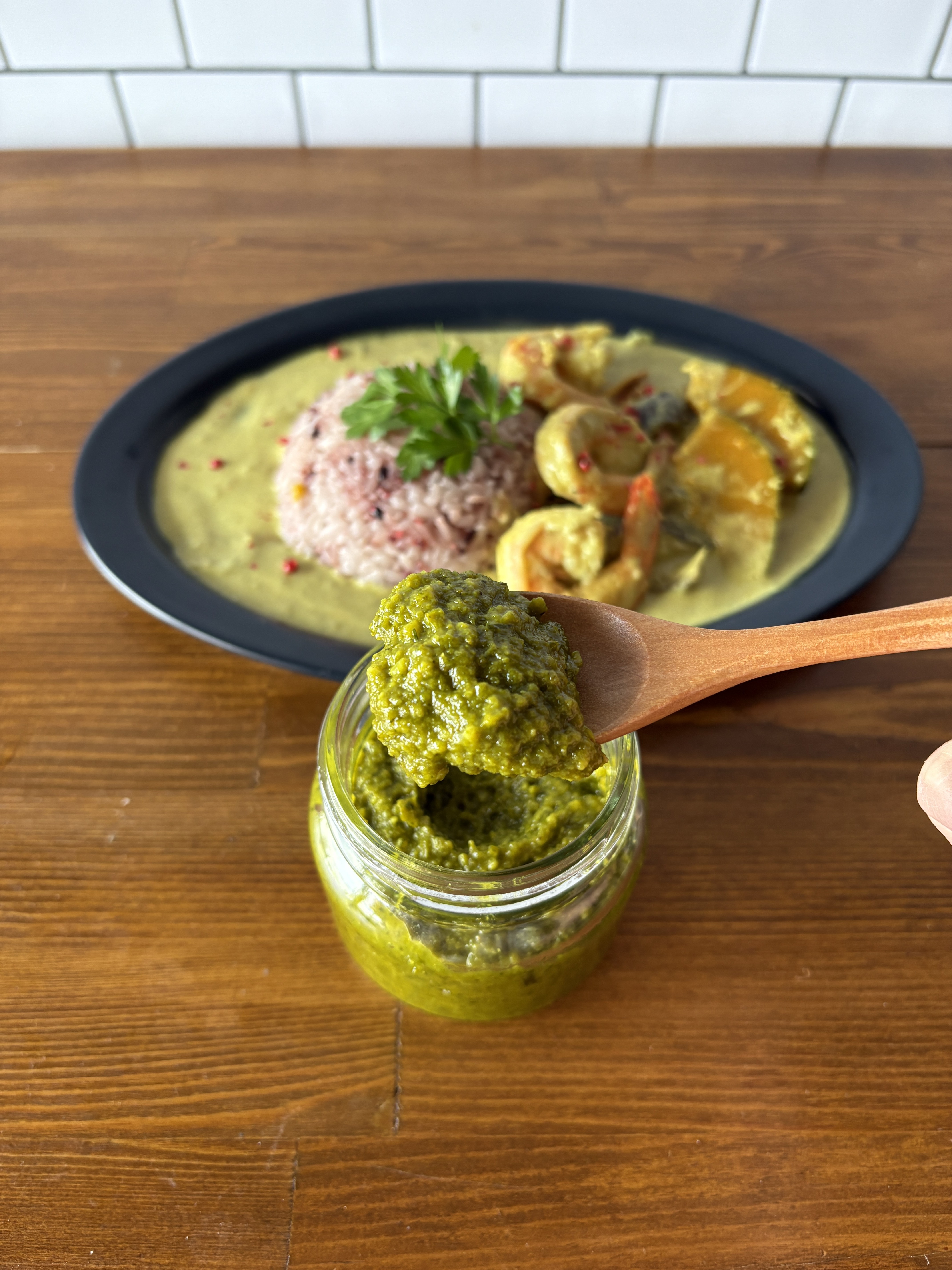 事前に用意しているカレー糀で海老のグリーンカレー作り。