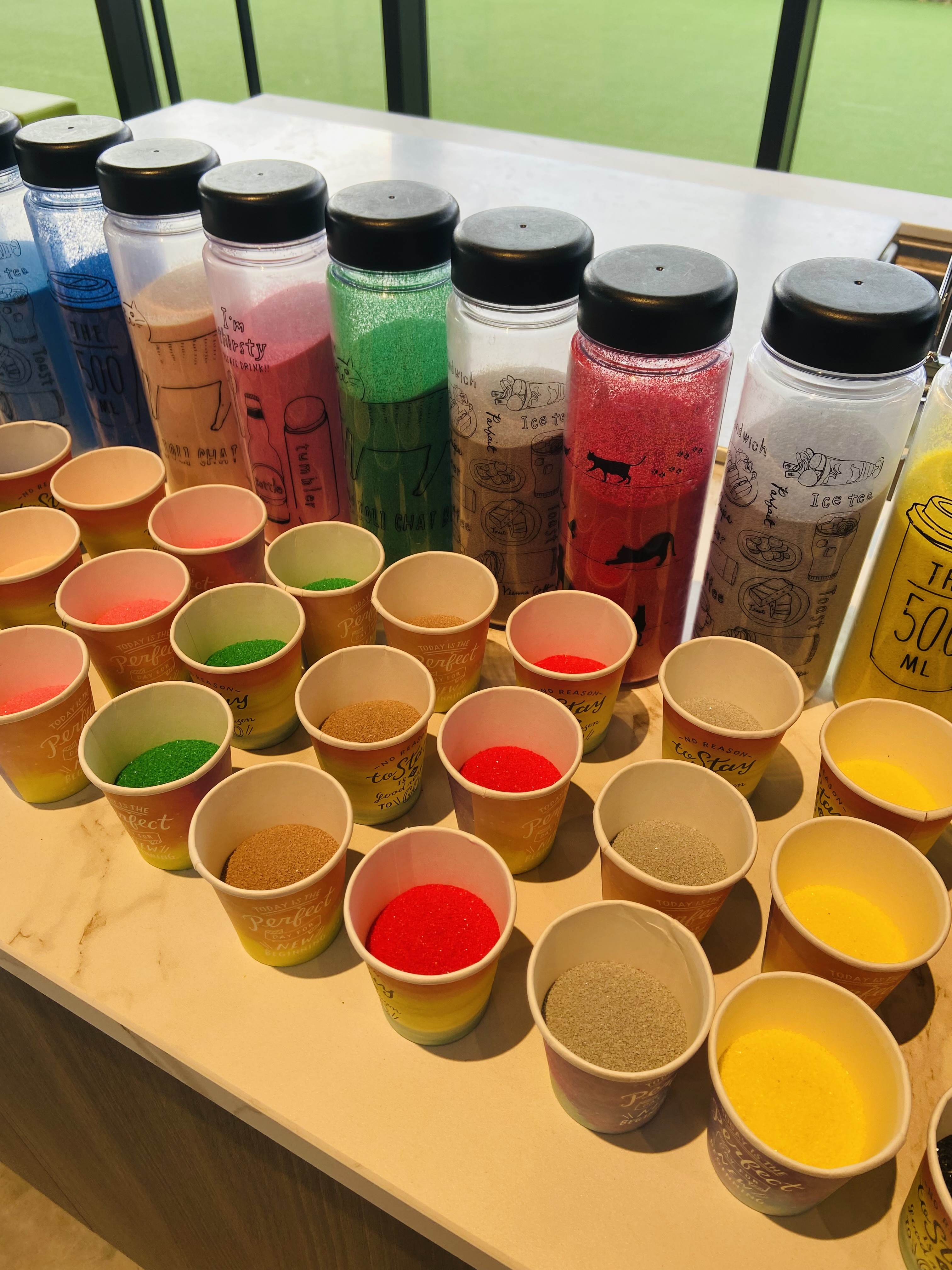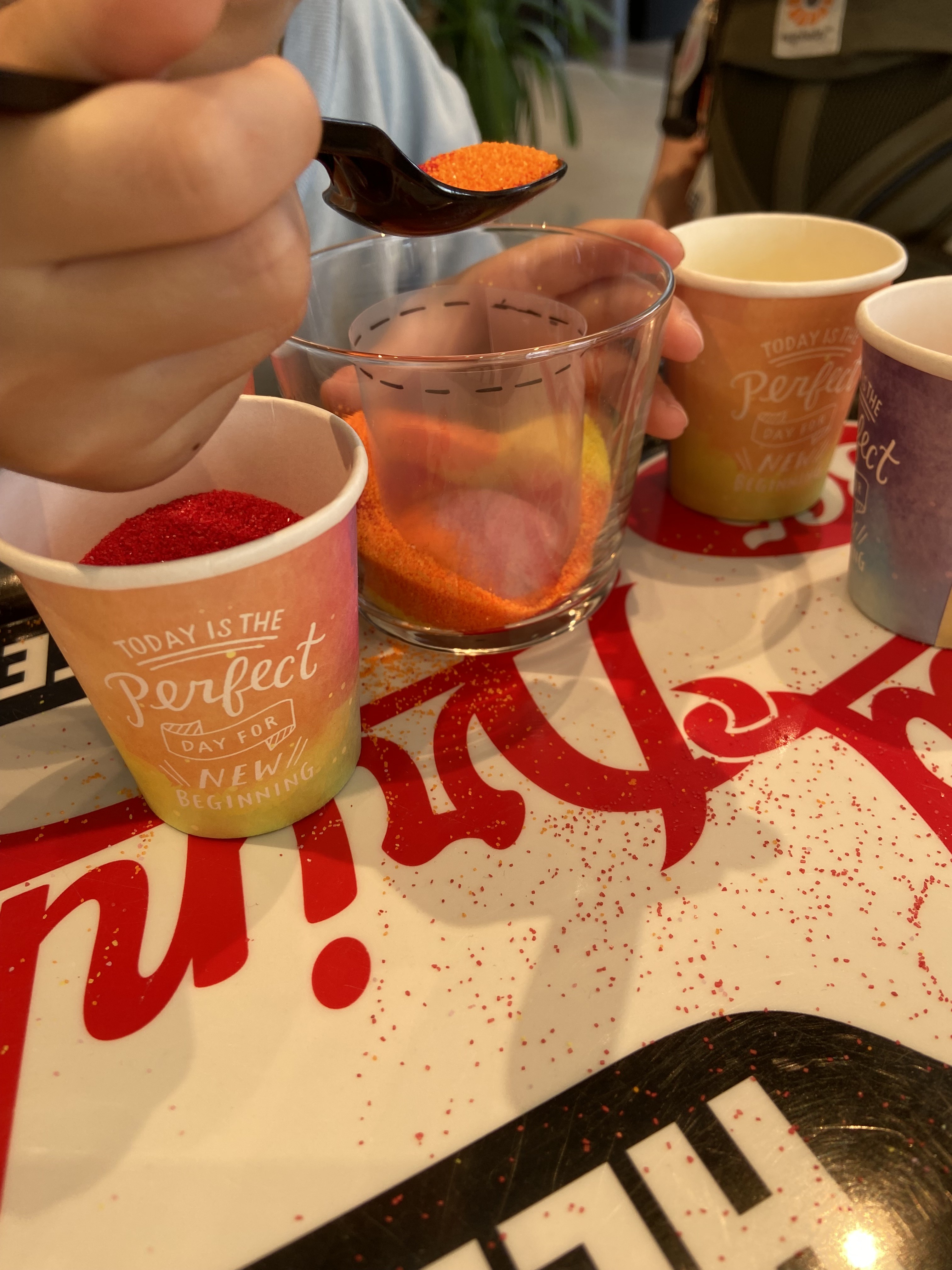 スプーンを持てる3歳からのお子様から参加可能です。カラーサンドの楽しさをたくさんの皆さんに知ってもらいたいと思ってます。