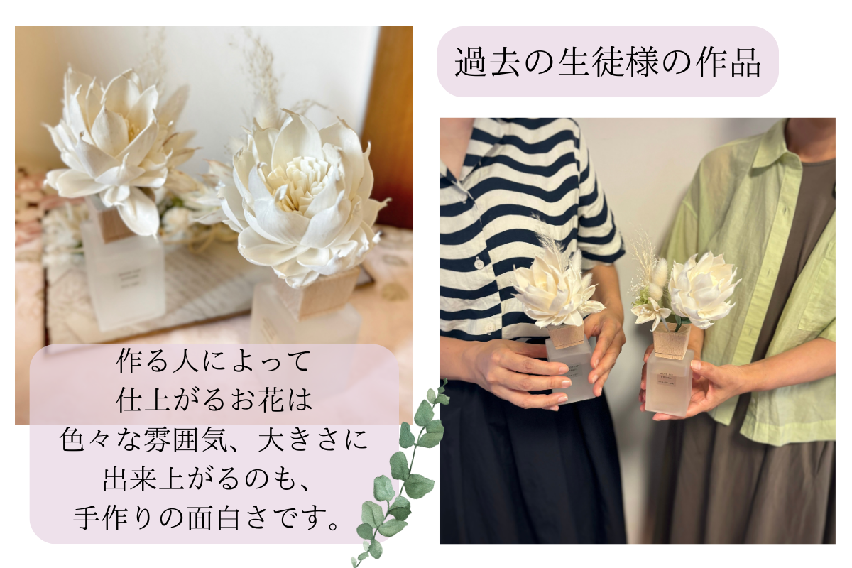このレッスンでは、ソラフラワーのシートからお花を手作りし、香りを楽しむディフューザーとして仕上げます。ナチュラルな雰囲気のお花と香りで、癒しの空間を演出しましょう。