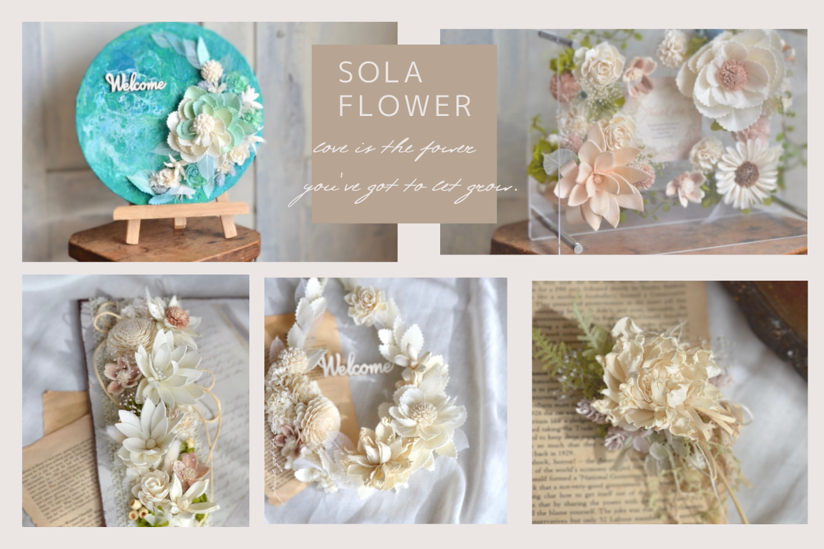 ソラフラワーは、タイなど東南アジアの水辺で育つ「ソラの木」からできた、自然素材のお花です。ソラの木のシートを花びらや葉の形に切り、一つ一つ手作業で丁寧に組み立てていくことで、自然の優しさと温もりを感じる、世界に一つだけの特別な作品が生まれます。